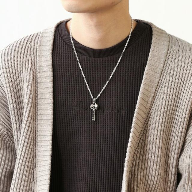 キーモチーフのシルバーペンダント。扉や金庫など何かを開ける鍵の上部には前後を見張る様にスカルの目(ジルコニアをセット)が光っています。開ける≒見張るの反する物を組み合わせた珍しいコンセプトのアクセです。