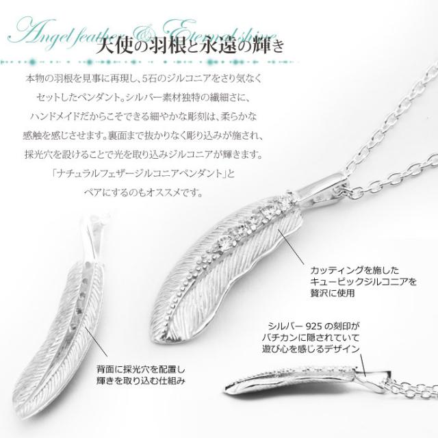 本物の羽根を見事に再現し、5石のジルコニアをさり気なくセットしたペンダント。シルバー素材独特の繊細さに、ハンドメイドだからこそできる細やかな彫刻は、柔らかな感触を感じさせます。裏面まで抜かりなく彫り込みが施され、採光穴を設けることで光を取り込みジルコニアが輝きます。「」とペアにするのもオススメです。