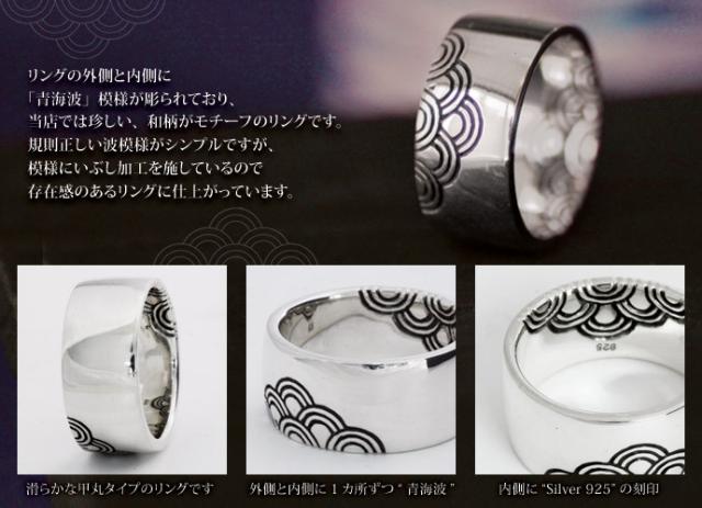 | 説明 | リングの外側と内側に「青海波」模様が彫られており、当店では珍しい、和柄がモチーフのリングです。規則正しい波模様がシンプルですが、模様にいぶし加工を施しているので存在感のあるリングに仕上がっています。 |