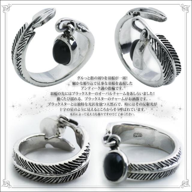 グルっと指の周りを羽根が一周!細かな彫り込で見事な羽根を表現したアンティーク調の指輪です。羽根の先にはブラックスターのオーバルチャームをあしらいました!動くたび揺れる、ブラックスターのチャームがお洒落です。ブラックスターとは独特な光沢を放つ天然石で、時にはその反射光が十字の星のように見えるところからそう呼ばれています。※石によって見え方も様々ですのでご了承ください。