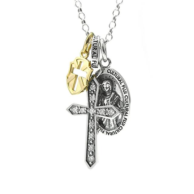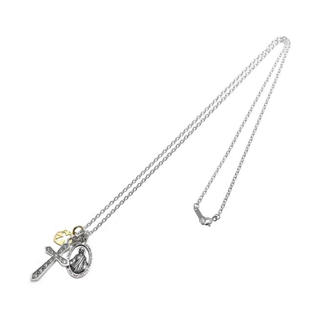 | 説明 | 中央のクロスにはジルコニアが11石セットされたゴージャスなデザイン。コインペンダントのマリアは繊細な調金が施され立体的なデザインが目を引きます。ゴールドシールドはワンポイントになり全体を上手くまとめ上げていますね。ペンダントの裏は奇麗に磨き仕上げをされており「FLUI」の丁寧な仕事ぶりが垣間見えます。クロスペンダントの裏には11ヶ所の穴が空けられておりここから光を通しジルコニアの輝きをアップさせる仕組みになっています。 |