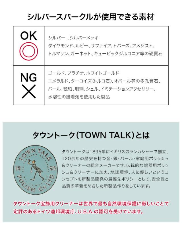 シルバー製のアクセサリーをお手入れするための、タウントーク社製洗浄液です。硫化した黒ずみや変色・汚れを落とし、本来の光沢を取り戻します。変色したシルバーを直接液1〜2分間浸すだけで輝きが甦ります。奥まった所の汚れ落としには付属のブラシを使用して下さい。水洗い後柔らかい布で水分を拭き取り、付属のシルバークロスで磨いて下さい。