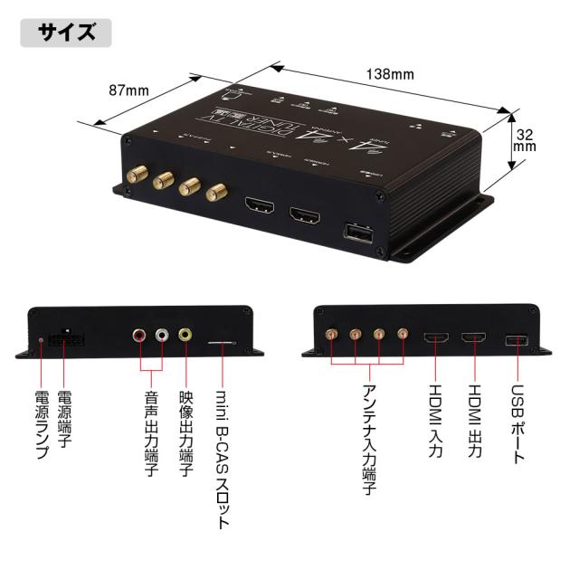 | 放送形式:ISDB-T地上デジタル放送方式(日本) チューナー:4チューナー&4アンテナ仕様 周波数・チャンネル:地上波UHF/470MHz〜770MHz(13ch〜16ch) 映像・音声出力:RCA×2、HDMI×1 映像・音声入力:HDMI×1 サイズ:約138(W)×87(D)×32(H)mm(突起部を除く) 入力電圧:DC12V/24V 保証期間:1年間保証 |