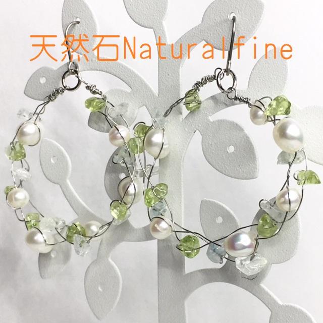 こちらは、天然石アクアマリンとペリドットそして淡水パールをステンレスのワイヤーで編み込んだピアス(イヤリング)になります。