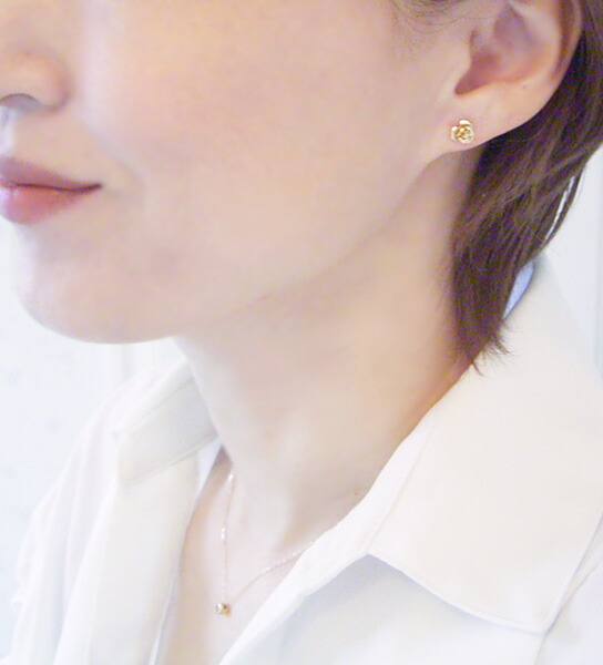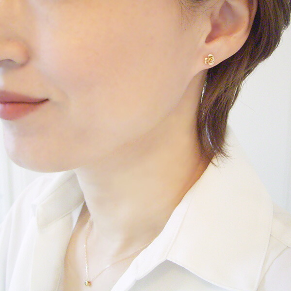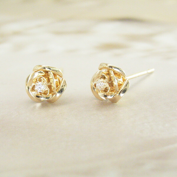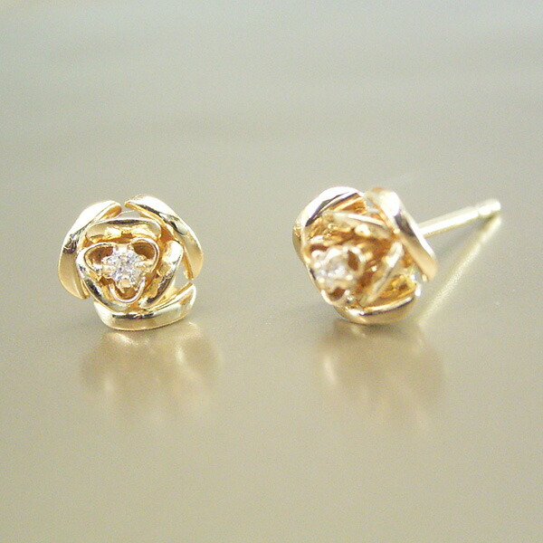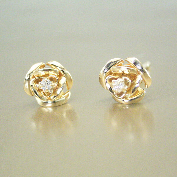 繊細で美しいバラの中央には天然ダイヤモンドが1石、キラリと輝いています。トップ部分もポスト部分もすべて18金ゴールドを使用。