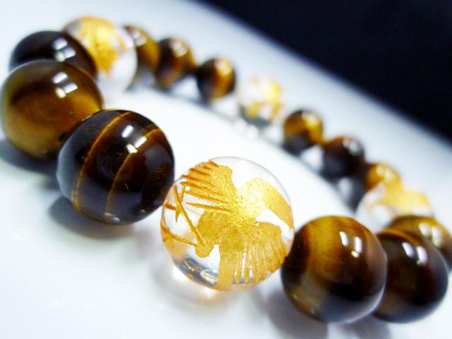 極上数珠!!四神獣金彫水晶14mm天然石タイガーアイブレス悪羅悪羅 金運・仕事運を導く![b010]