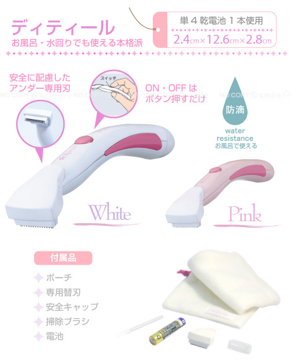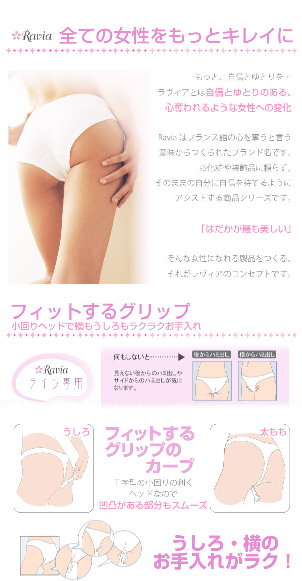 時間や費用をかけずにムダ毛のお悩み解消しませんか?ショーツから出てしまうアンダーヘアでお悩みの女性にオススメ。横・うしろからのはみ出しを防止し、お手入れができる[Raviaボディケアシリーズ]Iライン専用シェーバーです。デリケートゾーンを傷つけにくい専用刃を使用した安心設計。フィットするグリップで小回りがくところがうれしい。横からも、うしろからも無理なく剃れます!さらに防滴仕様なのでお風呂・水回りでも使える。ポーチつきで旅行や外出先へも持ち運びしやすい。