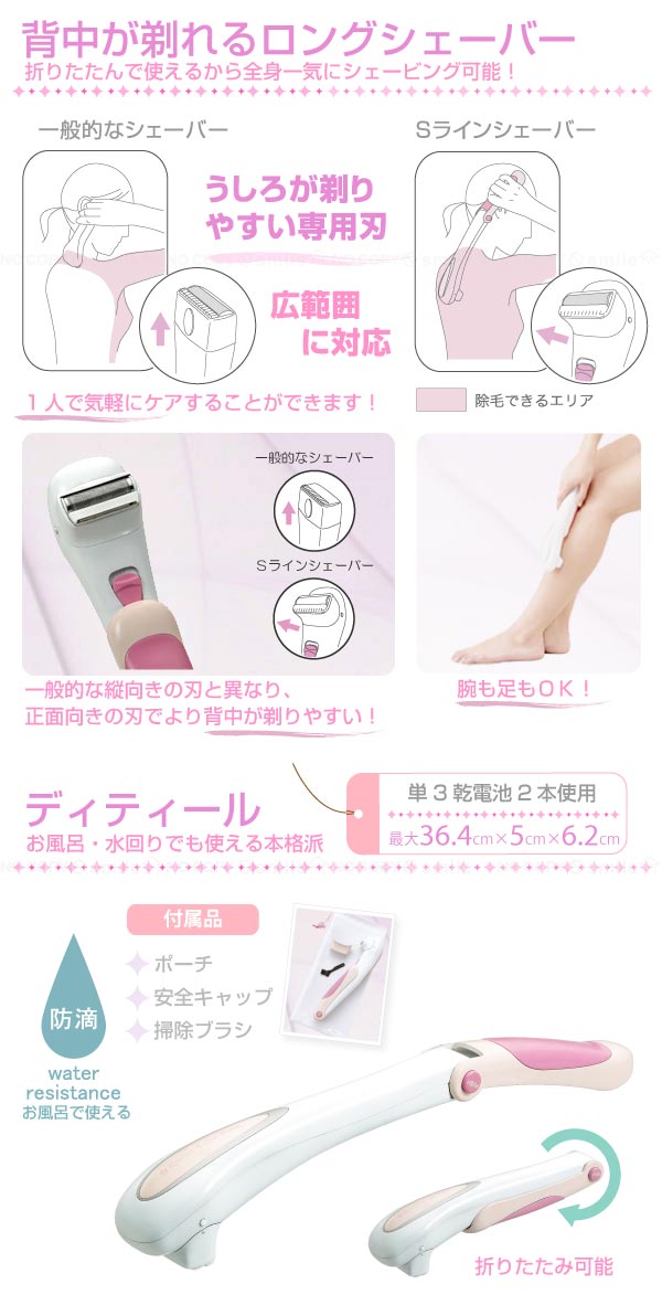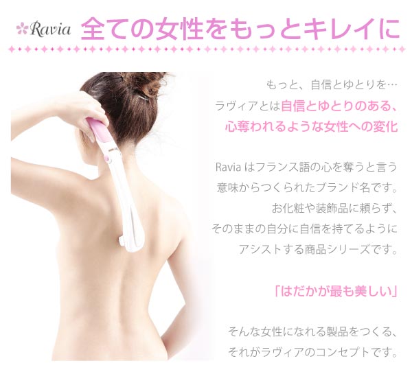 時間や費用をかけずにムダ毛のお悩み解消しませんか?1人では手の届きにくい肩・背中・腰周りのムダ毛を一掃![Raviaボディケアシリーズ]全身用シェーバーです。折りたたみ式のグリップを伸ばし、孫の手感覚でシェービング!一般に使用される縦向き刃ではなく、刃自体が正面を向いているため、背中にジャストフィット。広範囲に対応でき、1人でもセルフケアがしやすい設計となっています。もちろんうしろだけでなく、折りたたんで腕や足の処理にも使えます。防滴仕様でお風呂や水回りでのご使用もOK。