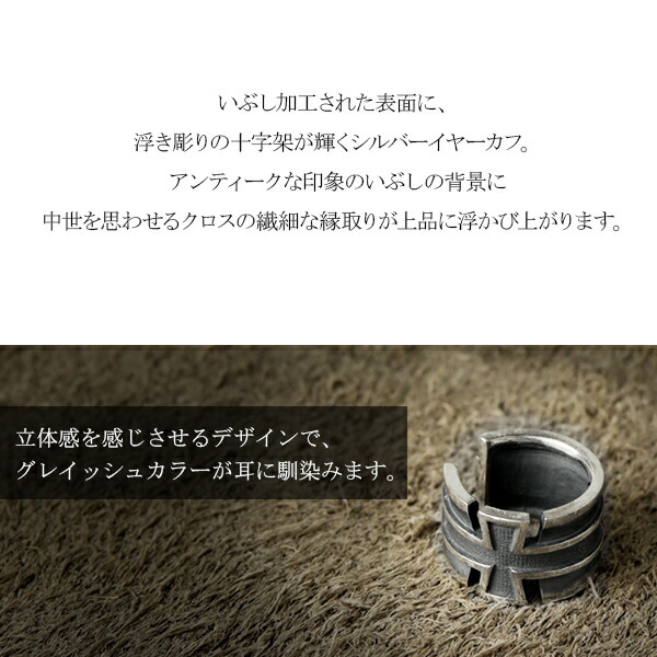 いぶし加工された表面に、浮き彫りの十字架が輝くシルバーイヤーカフ。