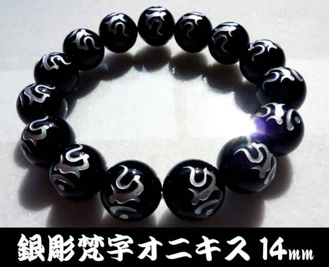 銀彫梵字オニキス14mm数珠ブレスレット パワーストーン 悪意を跳ね返して身を守る自己防衛の石