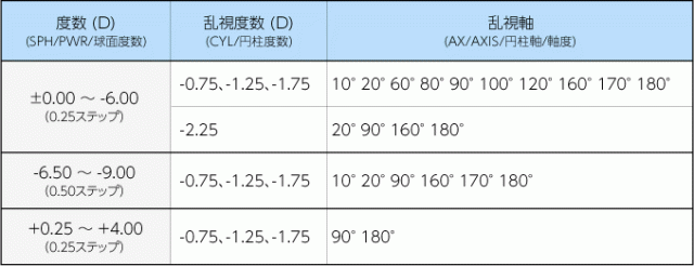 ワンデーアキュビューモイスト<乱視用>は下記の種類のレンズ度数がございます。