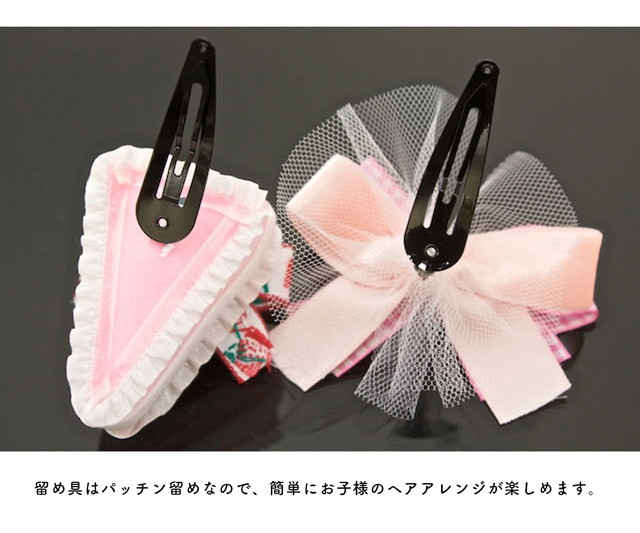 取り付けはパッチン留めになっておりますのでどなたにも簡単にお子様のヘアアレンジをしていただけます。