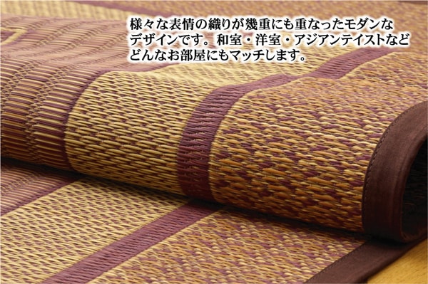 現代のライフスタイルに合う、洗練されたモダンなデザインのい草カーペットです。 和室・洋室・アジアンテイストなどどんなテイストのお部屋にもマッチするデザインです。 国産(九州産)のい草を使用しています。 一本一本が太く表皮が厚く繊維がキメ細かいので弾力性があり、 耐久性に優れています。 い草に青森ヒバ加工を施しています。(抗菌防臭効果) ※天然素材ですので多少の目飛び、ささくれ等がある場合がございます。 |