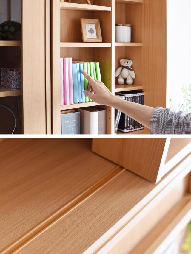 スライド棚に付属している2枚の棚板は、収納するものに合わせて高さの調節が可能です。中央の棚は固定棚です。
