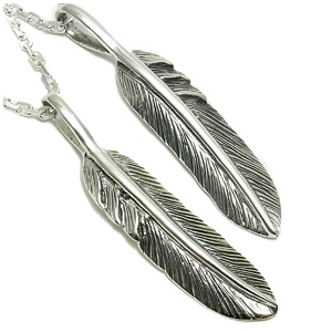オーソドックスなフェザーモチーフのペンダントトップです。こちらは比較的シャープな羽根で、デザインとしては引き締まった印象のフェザーとなっています。
