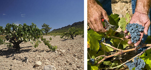 ムルシア州北部にあるフミーリャは、夏は40℃に達するほど暑く、冬はしばしば氷点下になるほど寒さが厳しい大陸性気候で、降雨量はわずか300ミリと乾燥しています。この過酷な自然環境のもと、収穫量が少なくなり、果実味豊かでパワフルなワインが生まれます。