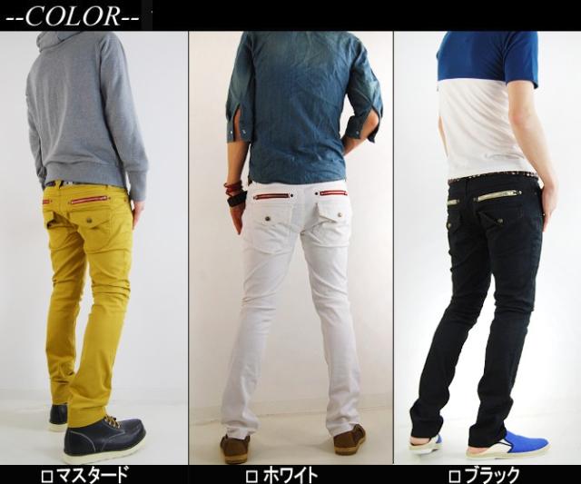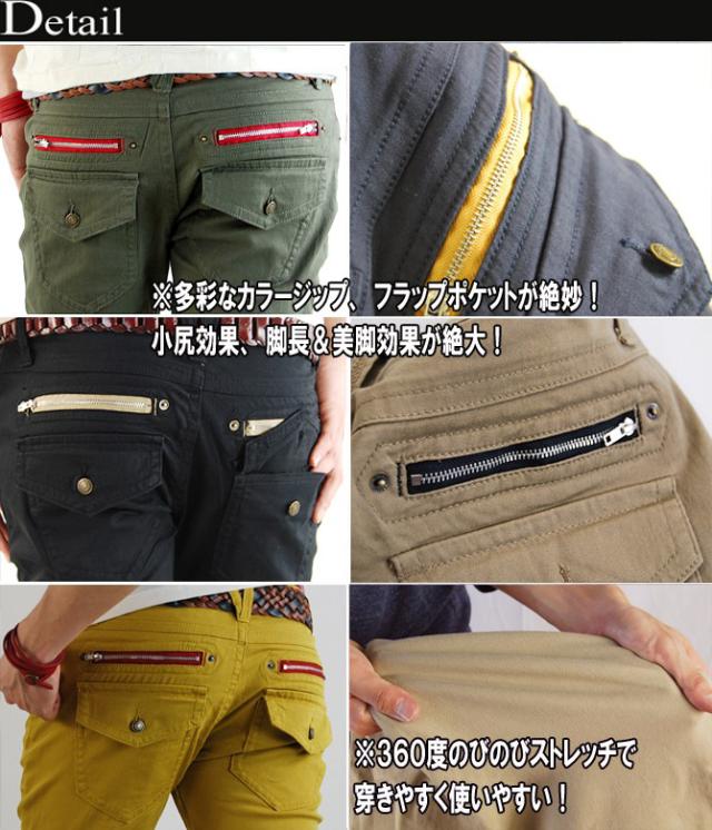 ローライズスキニーシルエットとバックのカラージップとフラップポケットのデザインで小尻・脚長効果が絶大!