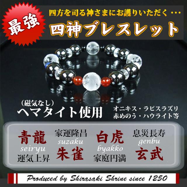 融通の神 白崎八幡宮 私共は鎌倉時代の建長2年(1250年)に創建され、763年の歴史がある、山口県岩国市の神社です。今までご崇拝くださった氏子・崇敬者の方 だけでなく、新しいご縁をいただくために、お神札やお守りを頒布させて頂いております。何らかの都合で神社へ出向けない方々にも神社を身近に感じていただ き、お神札やお守りを受けていただく、仲取持ちになれればと思っています。四神(玄武・青龍・朱雀・白虎)を四点に置き、ヘマタイトで結んだ、男性用ブレスレットです。「玄武」には降りかかる病魔を祓い、人間関係を良くし、息災長寿と子孫繁栄を授ける力が、「青龍」には運気上昇・立身出世・商売事業営業の発展成功を呼ぶ力が、「朱雀」には地位向上・家内安定・福徳平安を約束する力が、「白虎」には財運を上昇させ、子宝と安産を授け、家庭円満・夫婦和合に導く力があるとされています。使用はヘマタイト12mm カット水晶 赤メノウ・ハウライト・ラピスラズリ・オニキス各6mm 風水四神水晶12mm■新作ブレス&新入荷お守り■今!ペアが熱い!心願ブレスレット■オススメ!人気のレディースブレス