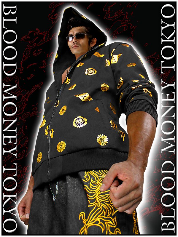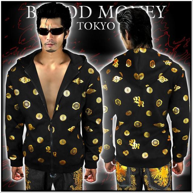送料無料!12037黒×金 BLOOD MONEY TOKYOパーカー モノグラム 総柄 ヤクザ悪羅悪羅系オラオラ系ヤンキーチンピラ不良チョイ悪服 悪党の店 バースジャパン BIRTHJAPAN