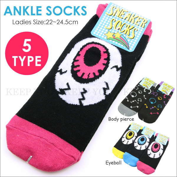 【6点までメール便280円対応】アンクル ソックス 目玉柄・ボディピアス柄 スニーカーソックス 靴下 オリジナル柄 レディース 【女性用 靴下 くるぶし ソックス パンク柄 ロック柄 インパクト 個性的】 ┃