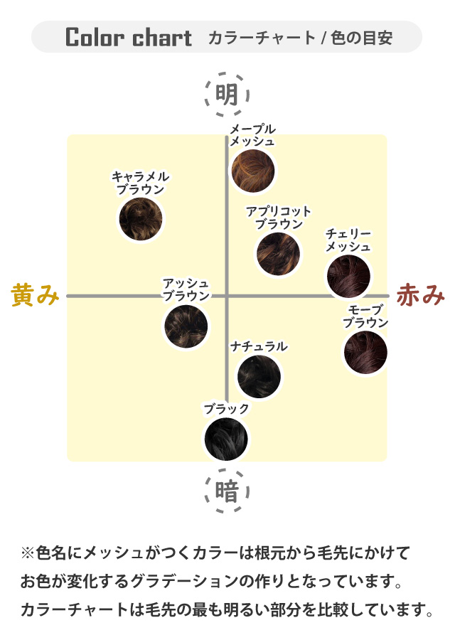 【明】メープルメッシュ(オレンジ系ブラウン)>キャラメル>アプリコット>チェリーメッシュ(ワイン系ブラウン)>アッシュブラウン>モーブブラウン>ナチュラル>ブラック【暗】