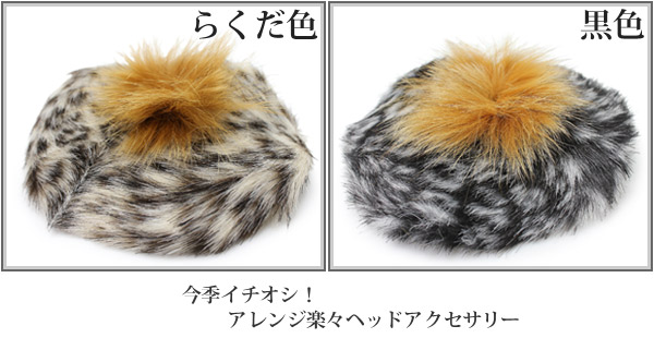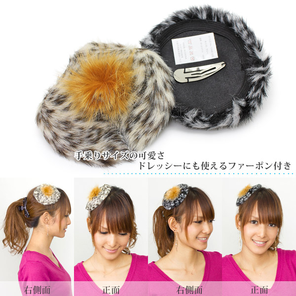 ふわっとしたファーが可愛らしい、ちょこんと頭に可愛く映えるヘッドアクセサリーを入荷致しました。付け方は簡単で、本体後ろにばね式のヘアピンが付いていますので、それを髪に挟んで止めるだけ。 髪の長さやバランスを見てつける位置は決めてくださいね♪大人っぽいレオパード柄ですので、普段使いは勿論、二次会などのパーティやドレッシーなスタイルにも最適です。