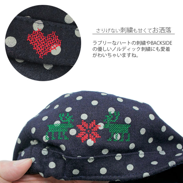 お洒落なオールドットのデザインキャップ。注目度No.1!!とても軽いので、長時間のお出掛け時にもオススメです。つばの裏側はモコモコの可愛らしいデザインに。普段は見えませんが、被る角度や横から見えた時にぐっとくるモテポイントですね。ラブリーなハートの刺繍やBACKSIDEの優しいノルディック刺繍にも愛着がわいちゃいますね。