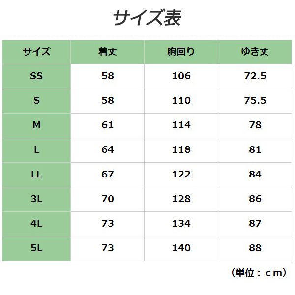 | サイズ | 着丈 | 胸回り | ゆき丈 |