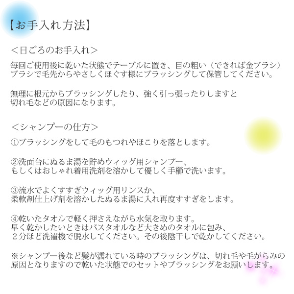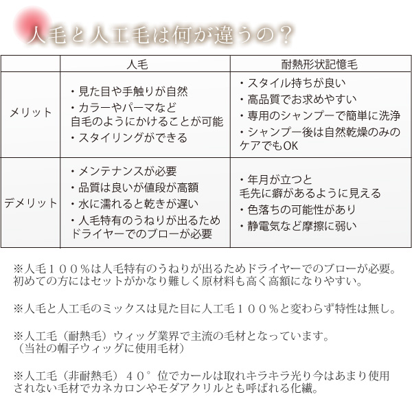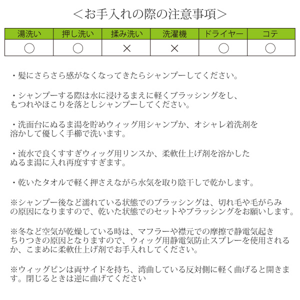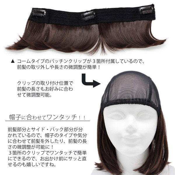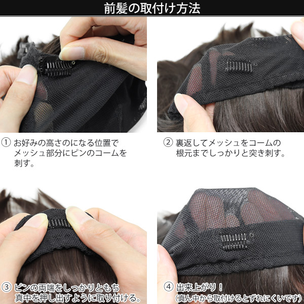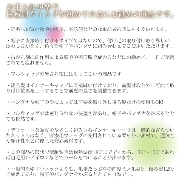 | 素材 | 付け毛:形状記憶耐熱毛 インナーキャップ:ポリエステル100%(医療用ウィッグのネットを使用) |