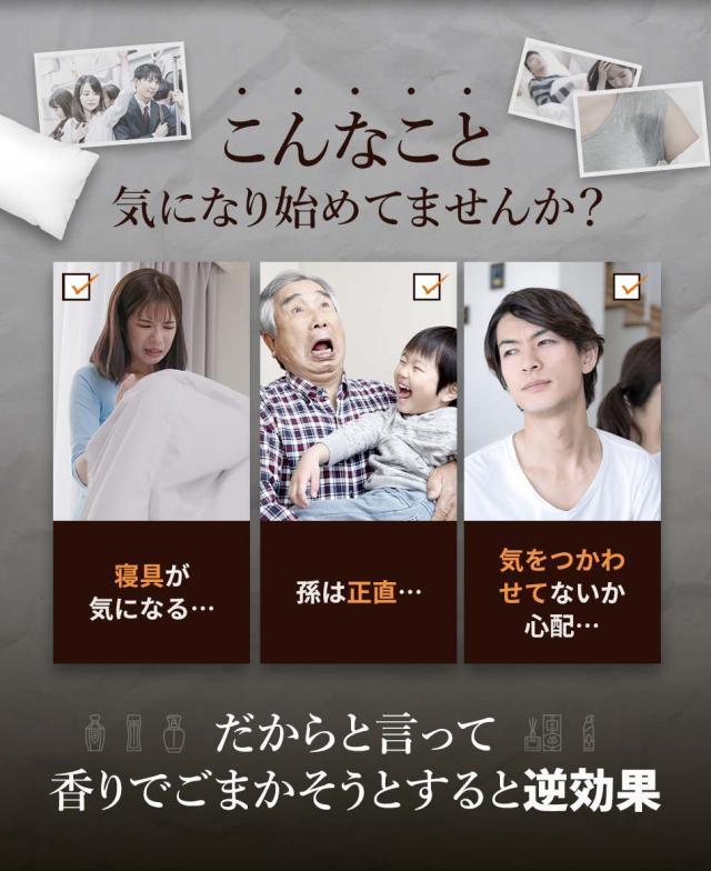 - 自分で自分の匂いは分からず、旦那に加齢臭が・・・と言われて買ってみましたが、あまり効果はありませんでした。
