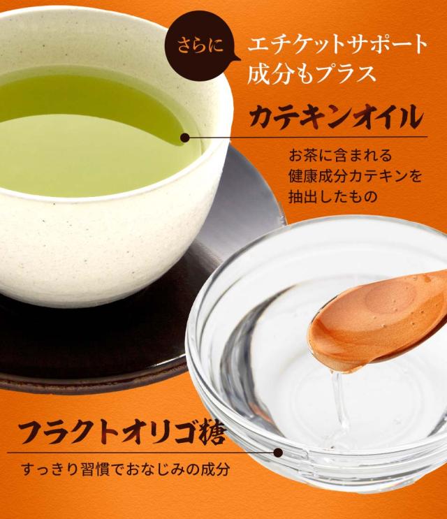 サフラワー油(国内製造)、フラクトオリゴ糖、カテキンオイル(食用精製加工油脂、チャ抽出物)、緑茶エキス末/ゼラチン、グリセリン、トレハロース、ミツロウ、グリセリン脂肪酸エステル、柿抽出物、香料、植物レシチン(大豆由来)