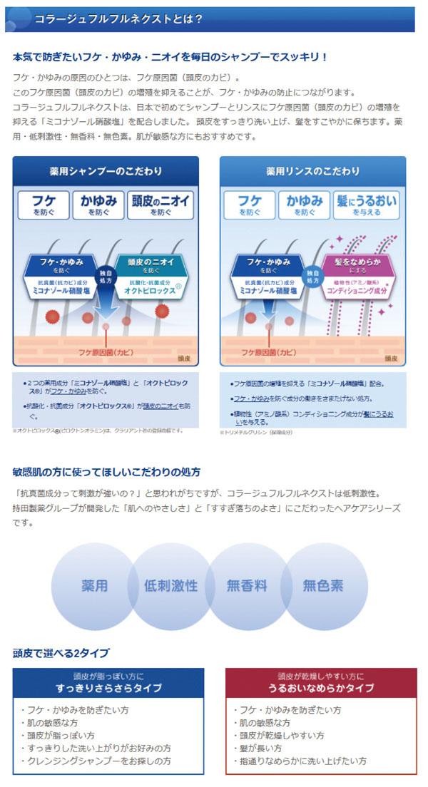 ●フケ・かゆみの原因のひとつに、真菌(カビ)がいますが、この菌(カビ)は、ほとんどの人にいる常在菌です。この菌が増えすぎると、フケ・かゆみの一因になることも。日頃から原因菌の増殖を抑えるフルフルネクストシリーズで、頭皮を清潔にし、すこやかに保ちましょう。