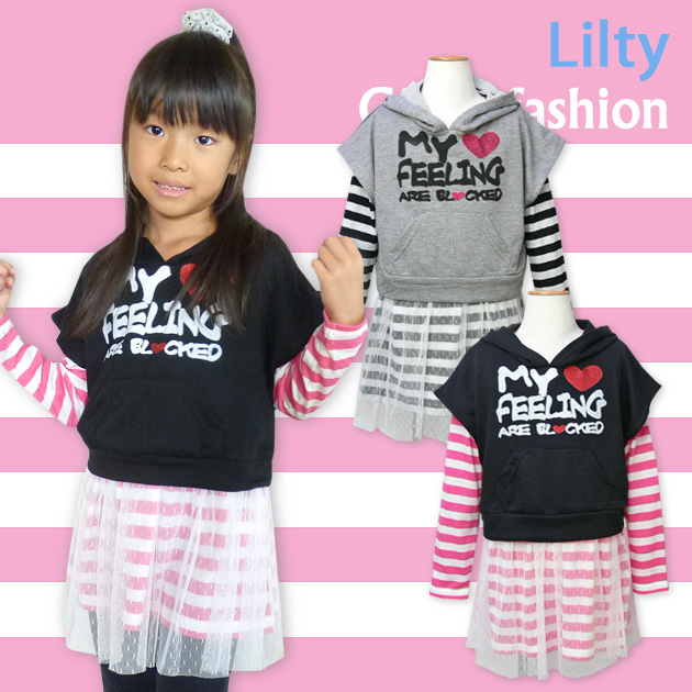 【女児キッズ】【アンサンブル】Lilty ラメロゴドルマンパーカー×ボーダー柄レース切替ワンピアンサンブル