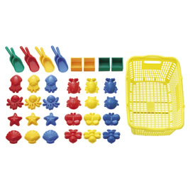 内容/砂型(カブトムシ・テントウ虫・チョウ・ハマグリ・タコ・イカ・ヒトデ・ハチ)各3個、スコップ:4色各2個、マス:2色各2個、カゴ1個