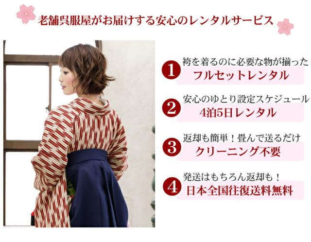 - 予定よりも早めに、丁寧な説明書とともに送付いただきました。その際も料金もそのままで 着付け先の美容室でも袴等状態が綺麗で、セットもきちんと揃っていてとても良いですねと言っていました。 写真通りの着物と...