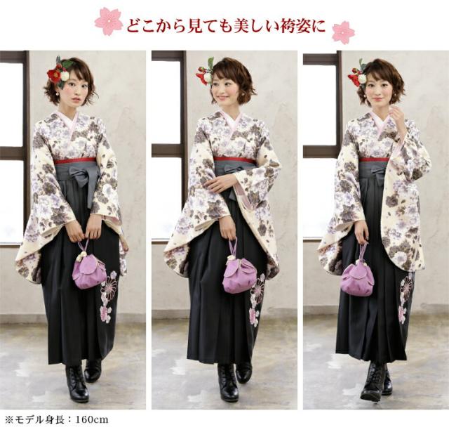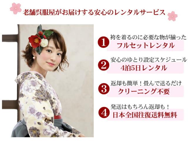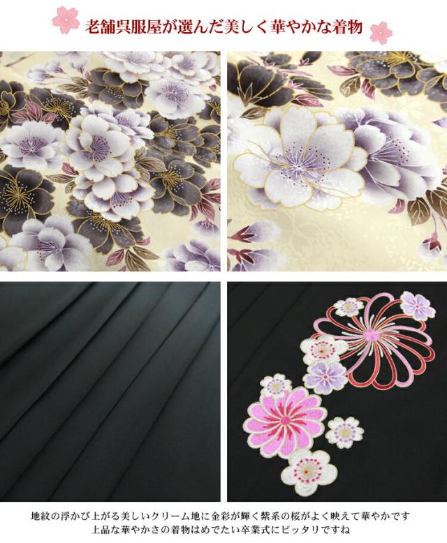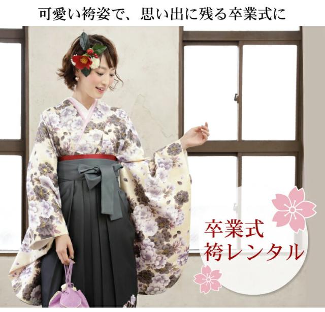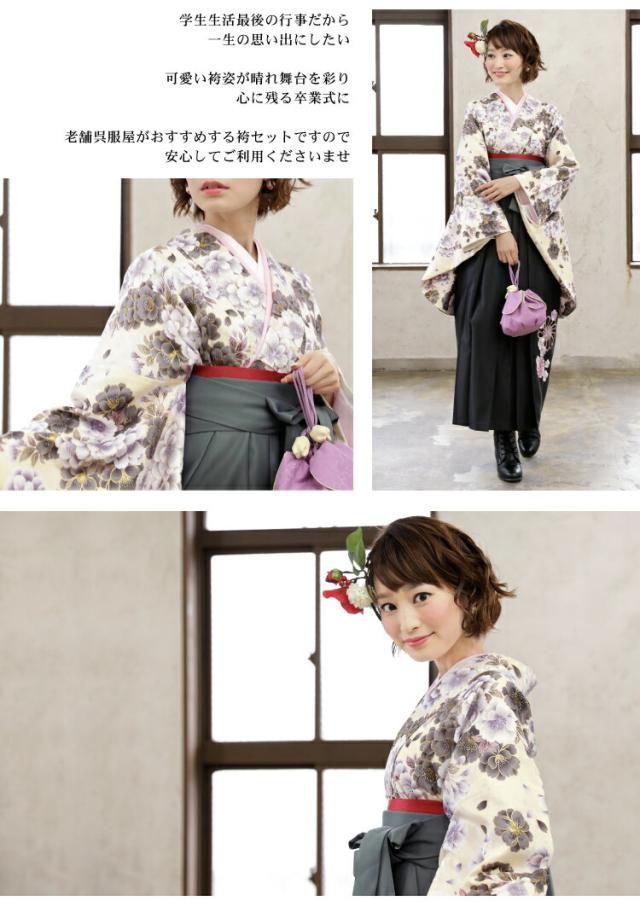 卒業式 袴 レンタル 女 女性 レトロ 袴セット 卒業式袴セット2尺袖着物&袴 フルセットレンタル 大学 小学生サイズあり 「クリーム地にグレーと紫の金彩八重桜」安い