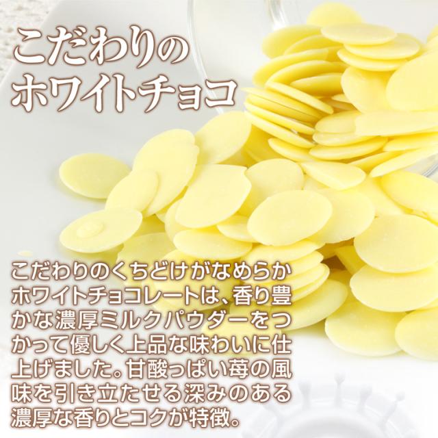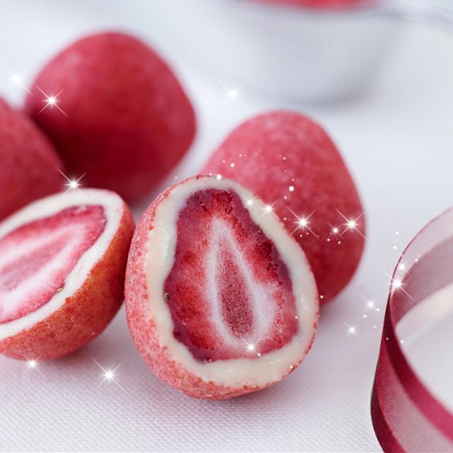 もぎたての苺をフリーズドライにして、ミルク風味のクリーミーなホワイトチョコでコーティング。苺の風味とサクサクした食感に、神戸フランツのプレミアムチョコレートを使用したなめらかな口どけとコクのある甘さを、甘酸っぱい苺パウダーが一層引き立てます。