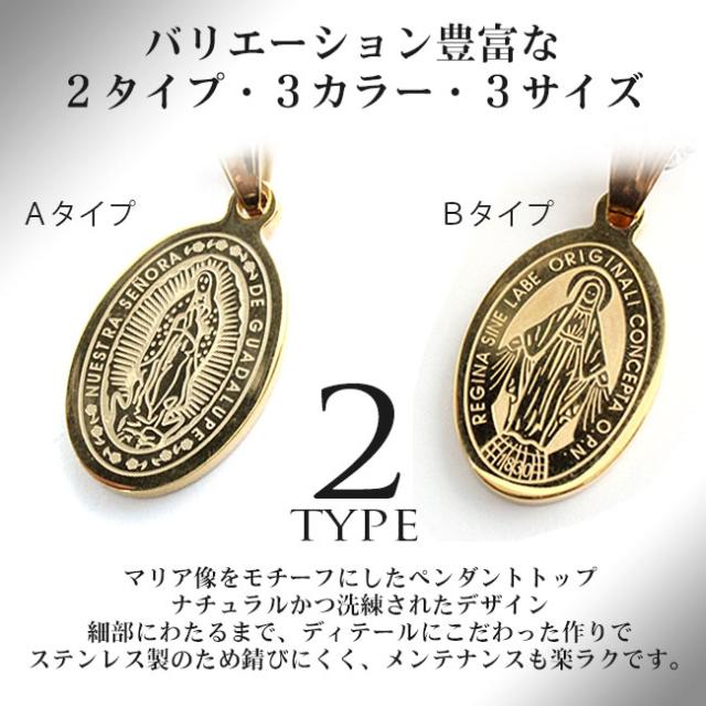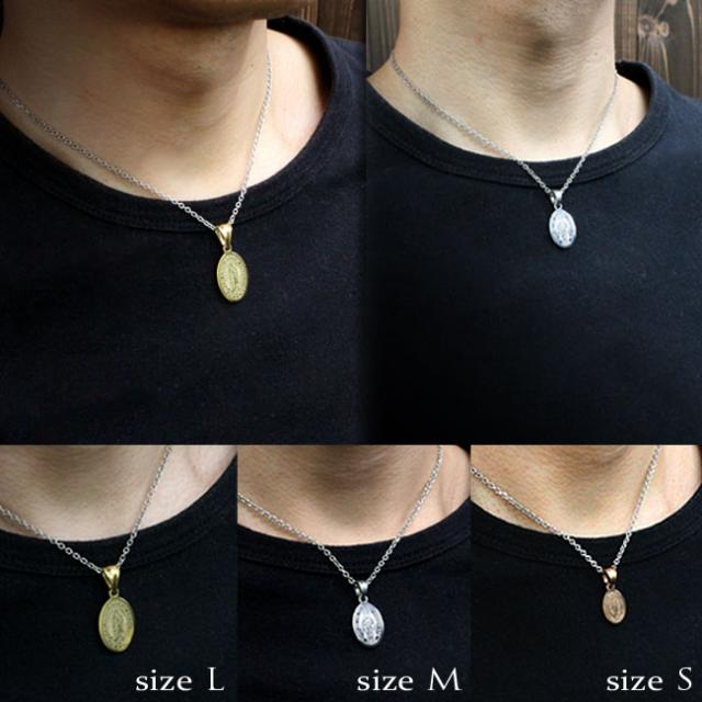 ポップな印象でマリア様が彫刻されているプレートタイプのステンレスネックレスです。
