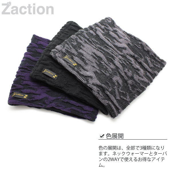 秋冬に大活躍のネックウォーマーがZactionオリジナルで完成しました。凹凸のある迷彩柄が特徴的なデザインで、ネックウォーマーとターバンの2WAYで使えます。カモフラージュのCOOLでちょっぴりワイルドなデザインもお洒落で、シンプルな服装への差しアイテムとしても十分な存在感です。特にウィンタースポーツのスキーやスノーボードなどでは、マフラーのようにかさばらないので重宝できますよ。
