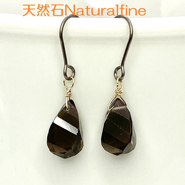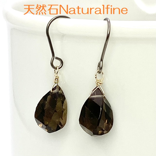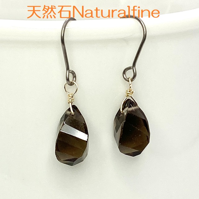 こちらは、天然石スモーキークォーツのツイスト4面ブリオレットカットです。 4面にカットされたのち表面を細かくカットしてあるので、見る角度により美しさが際立ちます!ワイヤーは、k14gfで金具は、チタンなのでアレルギーの方にもおすすめです。