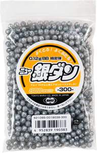 - 東京マルイの0.12gBB弾は二種あって、所謂ハダ色のとニュー銀ダン。銀玉鉄砲のタマを彷彿させるニュー銀ダンが私のお気に入り。散弾銃の散弾にも見える所もお気に入り。