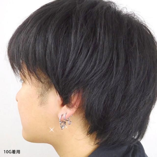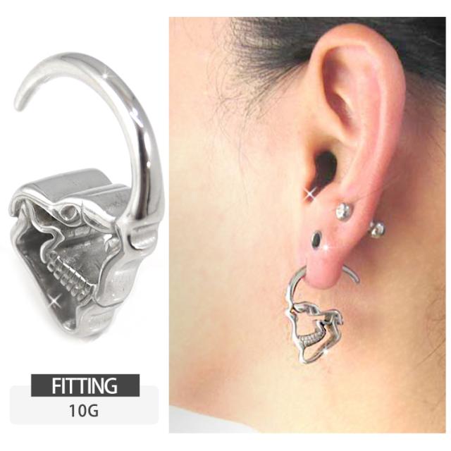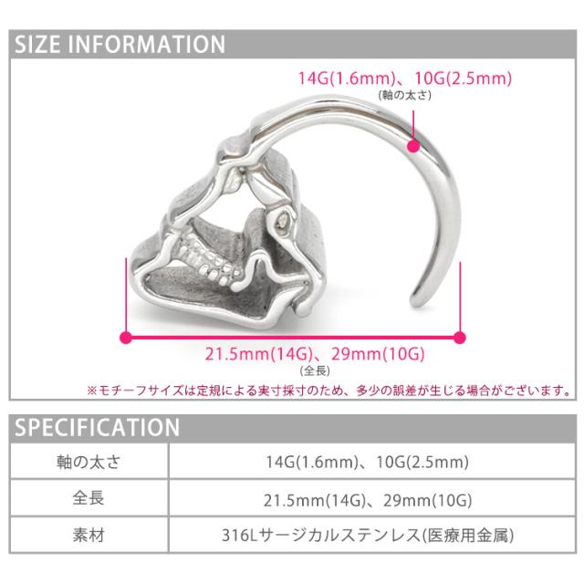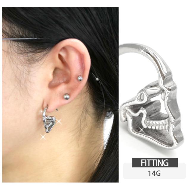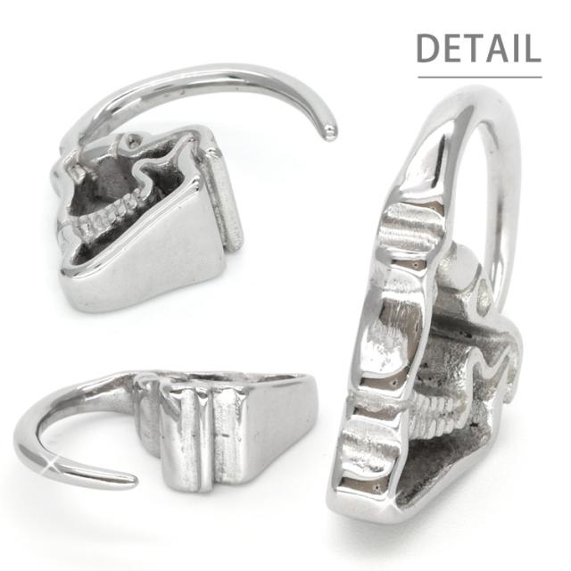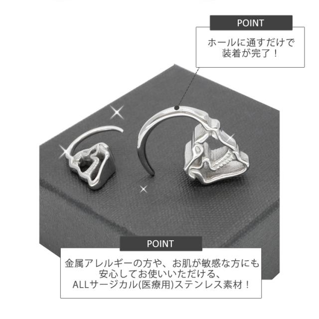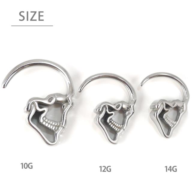 一度見たら忘れられない、不気味に笑うスカルの横顔がそのままジュエリーになった、とっても個性的なボディピアスです。人気が高いだけに種類も多いスカルモチーフの中でも、ちょっと他では見ない独特のデザインで当店イチオシのアイテムです。引っ掛けるだけのクロウタイプは、装着もカンタンです。徐々に太くなっていて、少しだけ拡張するのも可能です。太さは3種類にゲージサイズをご用意し、スタンダードな14Gから12G、10Gとちょっぴり太目のサイズにも対応しております。もちろん全てがアレルギーが起きにくいサージカル(医療用)素材なので安心。耳たぶだけでなく、ヘリックスなど耳の軟骨に着けるとインパクトは抜群です。