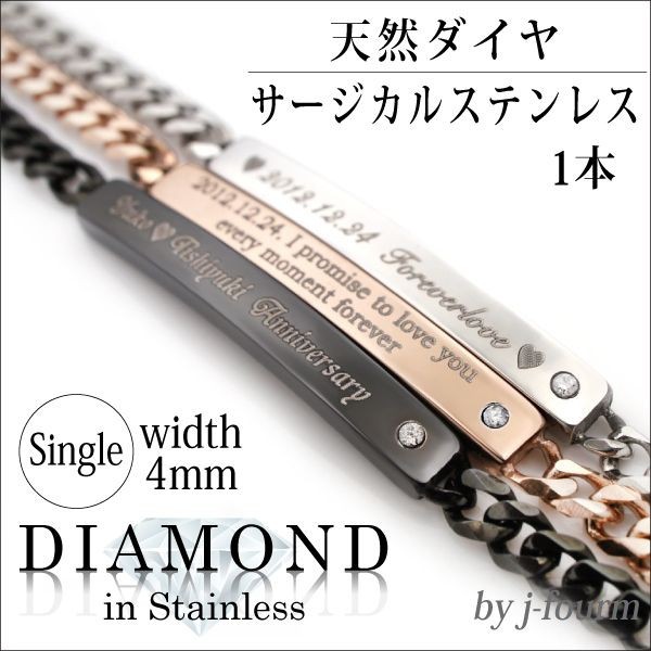 送料無料 刻印無料 ネーム刻印 ダイヤモンド IDブレスレット ステンレス 4mm 幅 腕輪 単品 サージカルステンレス