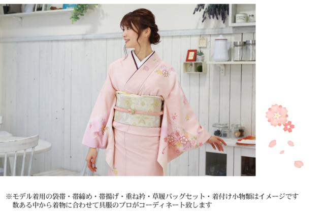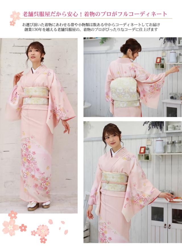 | ※モデル着用の袋帯・帯締め・帯揚げ・草履バッグ・小物類の色、デザインはイメージです。 数ある中から呉服のプロがコーディネートしてお届け致します。 | |||