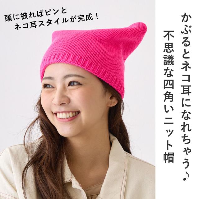 角がちょこんと立って猫の耳のように見える、不思議な四角いニット帽です。