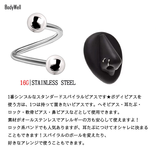 スパイラルバーベル 16G 選べる内径サイズ スタンダード ステンレスピアス ボディピアス イヤーロブ ヘリックス 軟骨ピアス つけっぱなし