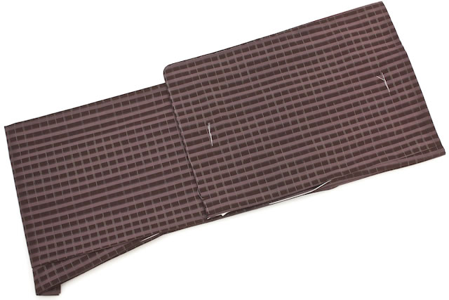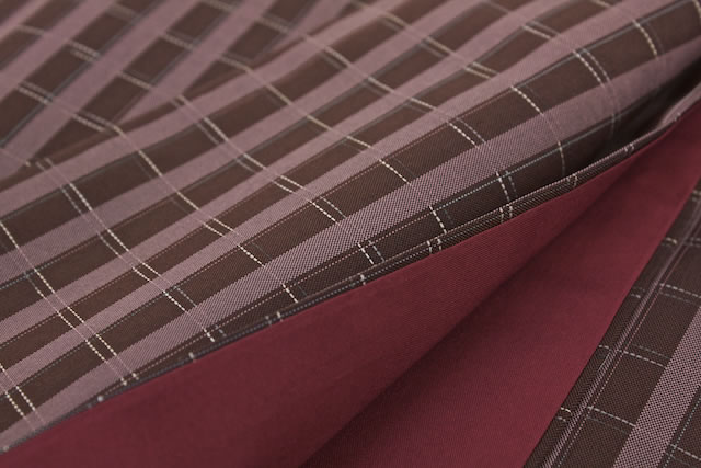 赤紫地に縦は太く、横は細く線の入った格子模様がデザインされています。