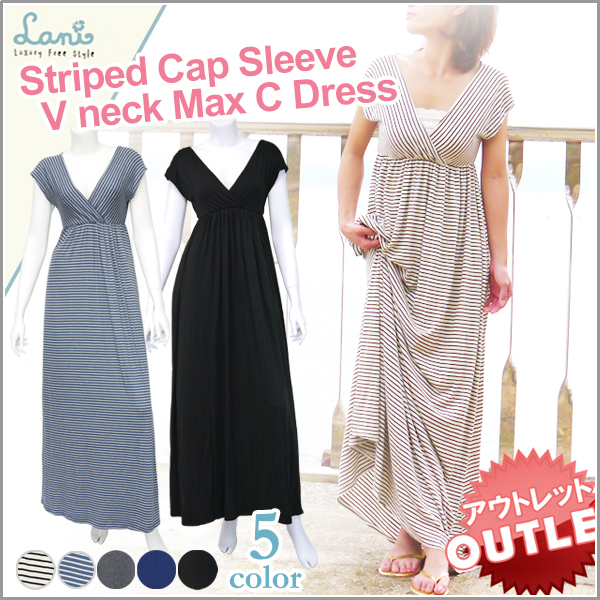 【ストライプ キャップスリーブ Vネックマキシドレス】