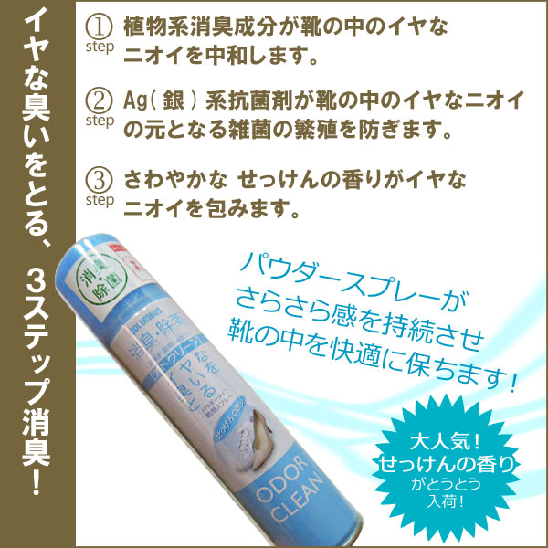 消臭・除菌でイヤな臭いをとるパウダータイプの靴用スプレー。 3ステップ消臭+パウダー機能が生みだす即効・持続・快適性!!植物系消臭成分が靴の中のイヤなニオイを中和、又、 Ag(銀)系抗菌剤が靴の中のイヤなニオイの元となる雑菌の繁殖を防ぎます。さわやかな、せっけんの香りがイヤなニオイを包みます。パウダースプレーがさらさら感を持続させ靴の中を快適に保ちます。