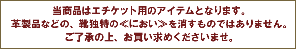 靴の表面にスプレーしないでください。多量にスプレーすると白く残ることがありますので注意して下さい。当商品はエチケット用のアイテムとなります。革製品などの、靴独特の≪におい≫を消すものではありません。ご了承の上、お買い求めくださいませ。